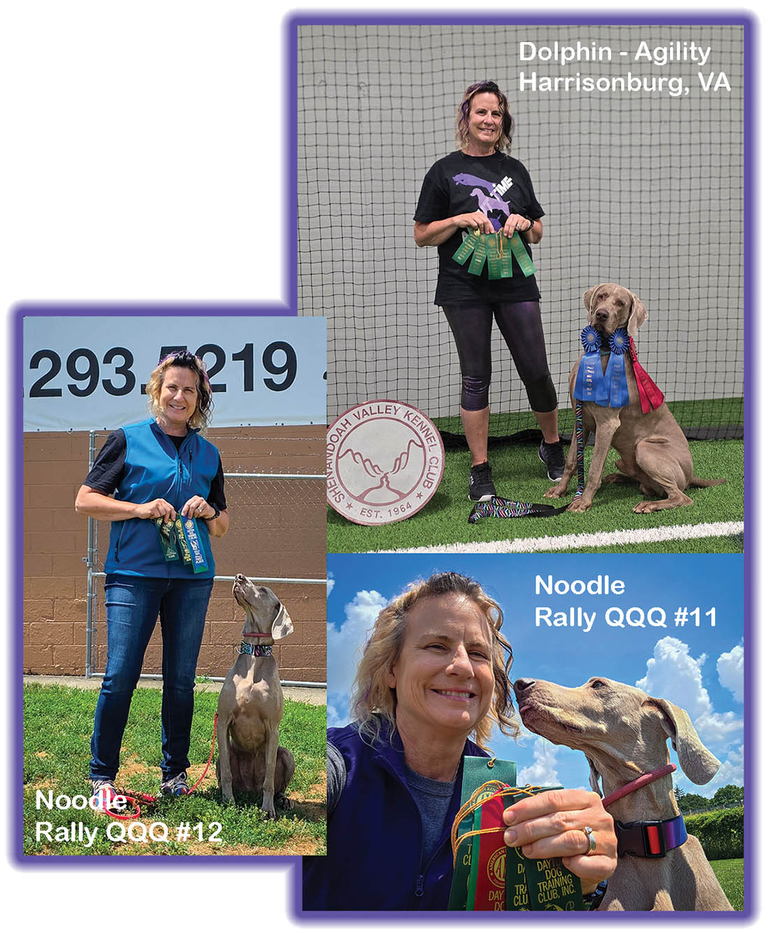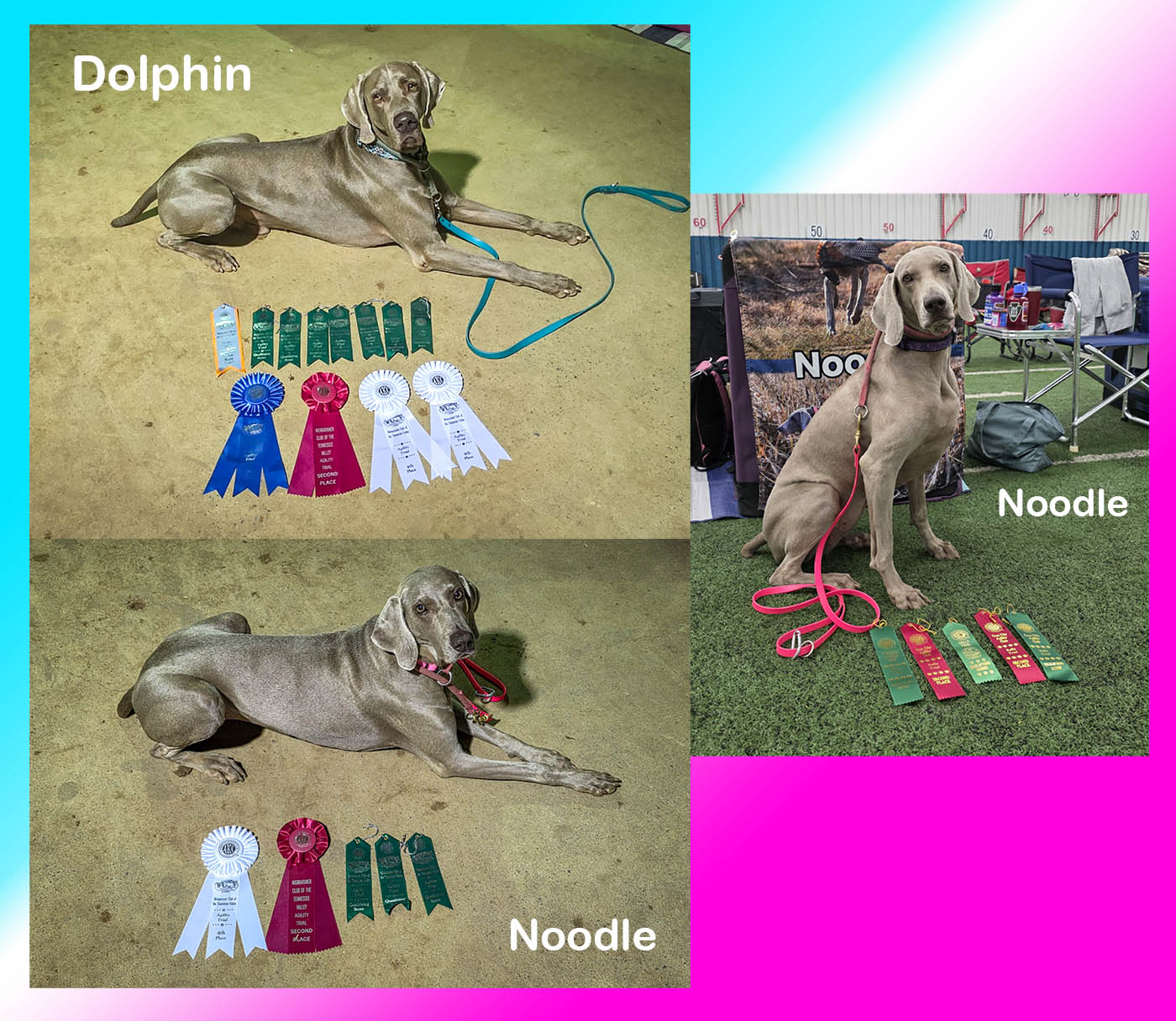 Noodle had an amazing showing at the 2024 Weimaraner National Specialty! She competed in Shooting Ratings, Retrieving Ratings, Agility, Rally, and Conformation. Noodle won the Most Versatile Senior Weimaraner for dogs aged 7 and older, and was second by only 1 1/2 points in the Most Versatile competition. She also qualified in Rally Master, Excellent, and Advanced, and won Rally High Triple. During the week in agility, she also earend a double QQ and a triple QQQ. The girl was on fire! She finished out the week earning a Tri-Athlete Award (her fourth in her career).