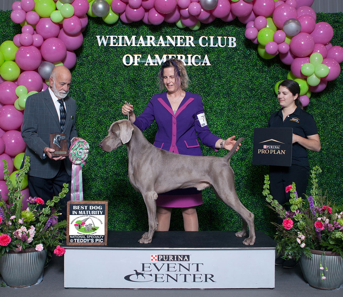 Dolphin topped off his show career by WINNING Best Dog in Maturity at the 2022 Weimaraner Club of America National Specialty!With this prestigious win, Dolphin is now a Futurity and Maturity winner, along with a second place in the Field Futurity. We are especially proud of this, as this is very rare for our breed to place in such versatile futurities.