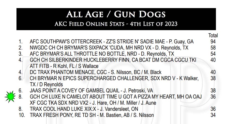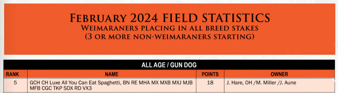 Pizza cracked the top 10 list for Weimaraners across the country competing in field trial Gun Dog stakes, after only trialing two weekends this year! In two weekends of 2023 she has earned two firsts and a second in gun dog stakes.