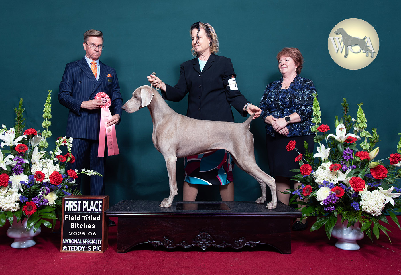 Noodle won her Field-Titled Bitch class at the 2025 Weimaraner National Specialty. She had the honor of not only winning the class, but also being the highest-titled in the field of all 100+ entries at the national specialty.