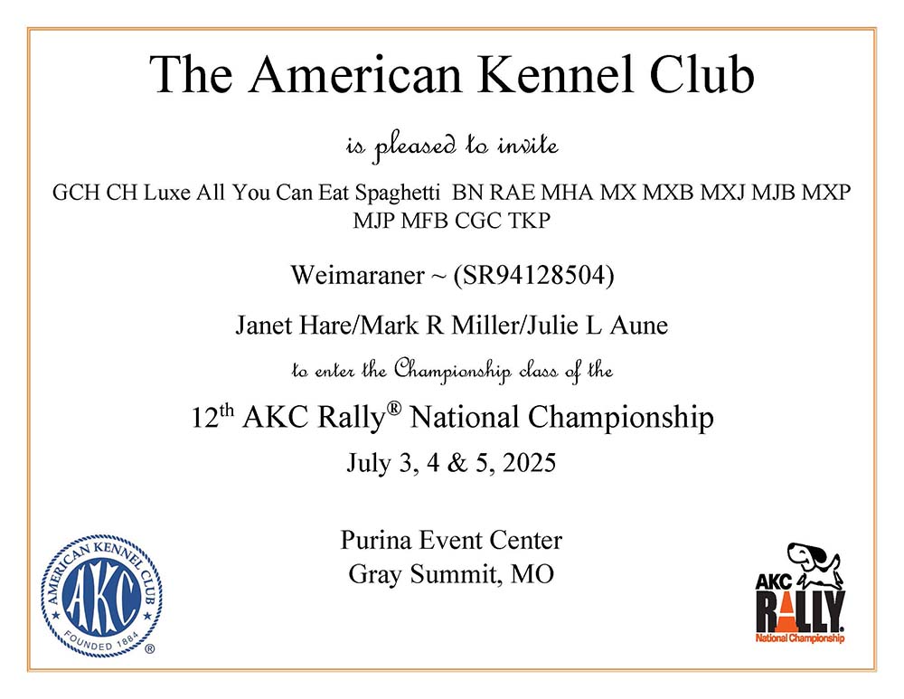 Noodle competed in the Excellent division at the 2024 AKC Rally National Championsips, and came away with three out of three qualifying runs.