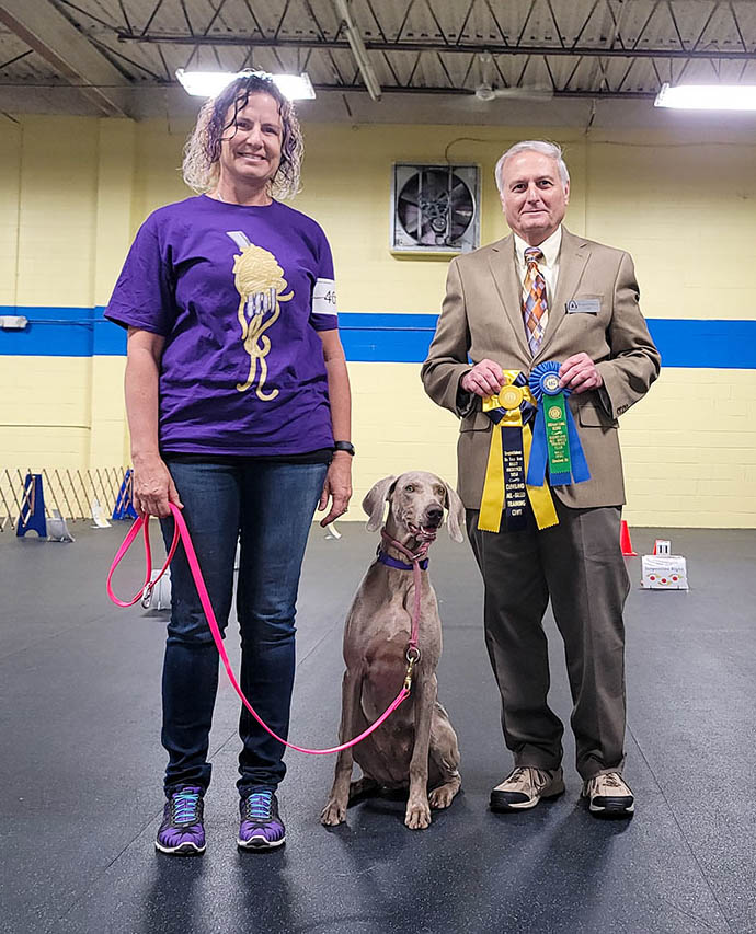 Noodle was a busy girl at the 2022 Weimaraner Club of America National Specialty! She qualified in 4 out of 5 runs in Masters agility, qualified in Rally and won the Rally Advanced class, qualified and earned a new title in Retrieving Dog, qualified in Beginner Novice Obedience, and won her Field titled Bitch class at the national specialty, earning her a Tri-Athlete Award (her third one in the past 3 nationals) and ended up in second place for Most Versatile Weimaraner, losing by only 3 points!
