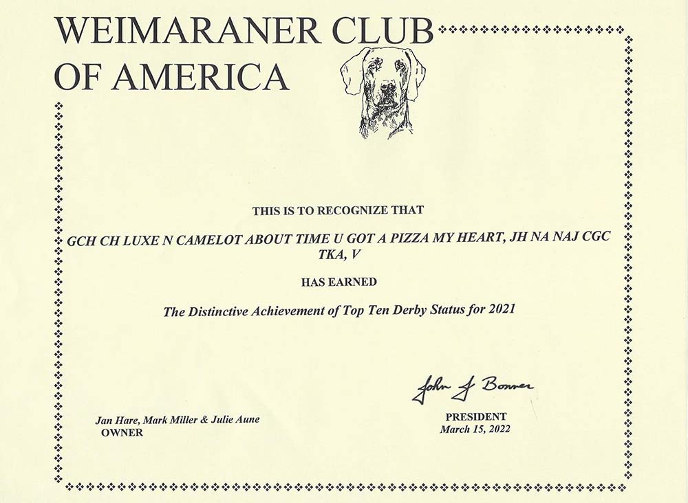 Pizza received a certificate from the Weimaraner Club of America for finishing 2021 in the top 10 of all Weimaraners in Derby (field). She ended up at #5 in her short Derby career. Pizza is the only grand champion to finish in the top 10 of any Weimaraner field statictics last year.