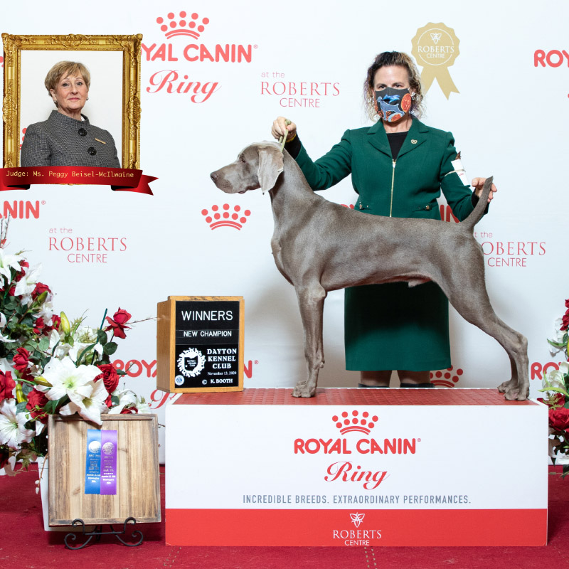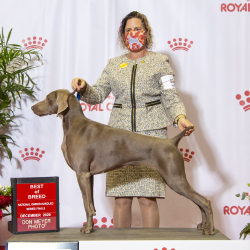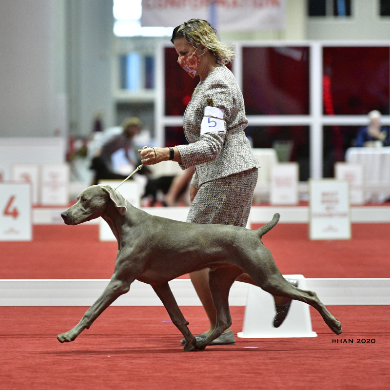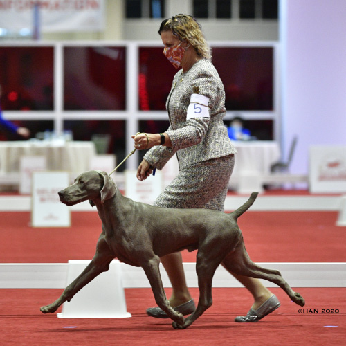 At 8 months of age (and the youngest Weim puppy in competition), Dolphin wins Best of Breed at the 2020 AKC National Championships Puppy Stakes.