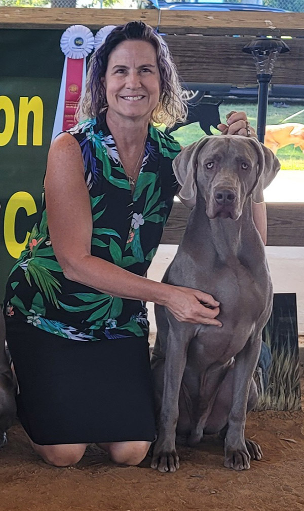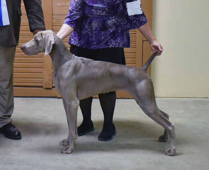 Dolphin traveled to Columbia, South Carolina for the 4 Weimaraner specialties, in which he was entered in three of them. He managed to earn a select dog and two best of opposites out of tough specials competition to earn three 5-point grand champion majors, finishing his Grand Championship at age 17 months! Dolphin had a great time in the ring, showing off his tricks and his always-wagging tail, along with his beautiful ground-covering side gait. Dolphin also won Best in Sweepstakes on Friday at the specialties.