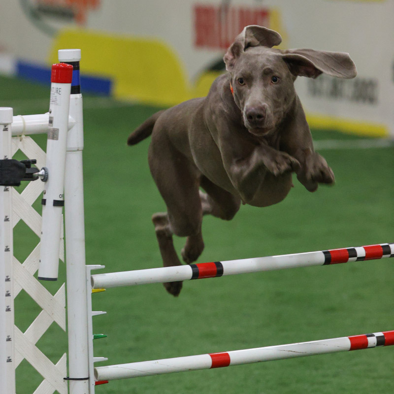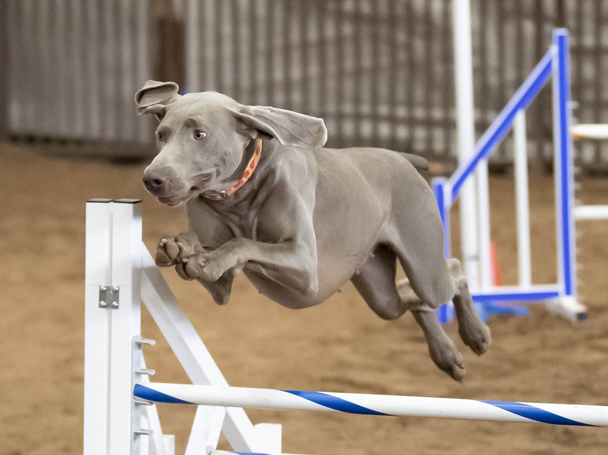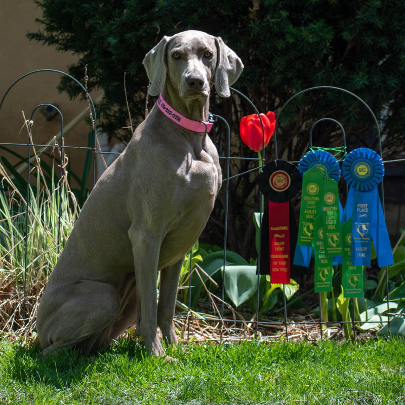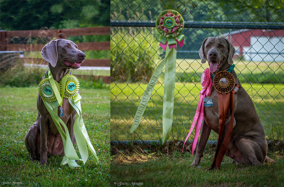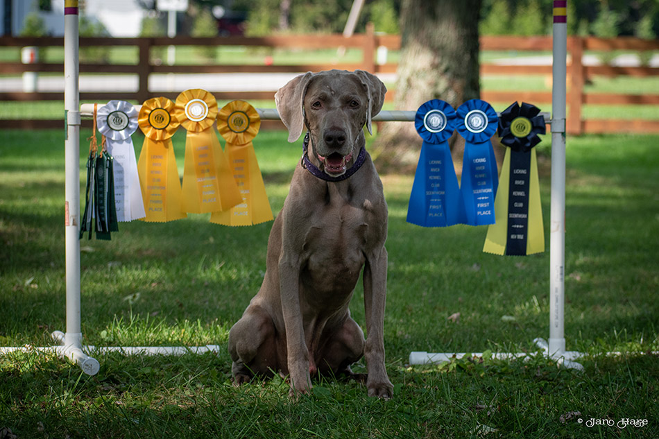 DOLPHIN: 4 qualifying runs in Novice Agility (including several first place awards), qualifying in Novice Shooting Dog, and competing in Best of Breed to not only earn his Tri-Athlete award, but was also awarded the 2021 Most Versatile Weimaraner Junior for dogs under 2 years of age!