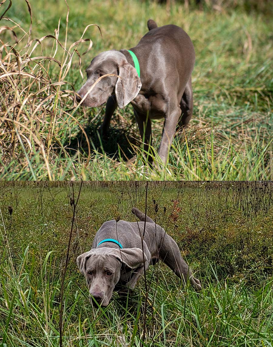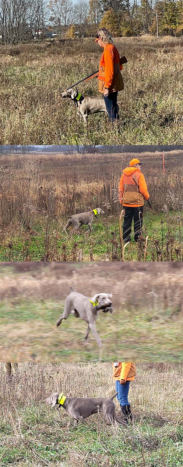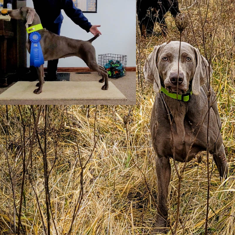 Pizza and Dolphin attended the WVA Ratings Test hosted by the Greater Cincinnati Weimaraner Club. Pizza was steady as a rock through the flush and shot and had a beautiful direct retrieve to earn her Shooting Dog (SD) rating. Dolphin was equally as steady to the flush and blank shot on multiple birds and showed beautiful hunting style (and a very dramatic point!) to earn his Novice Shooting Dog (NSD) rating. Pizza also earned another Senior Hunter leg in the hunt test earlier that day, and Dolphin earned a Junior Hunter leg (again holding steady through everything).