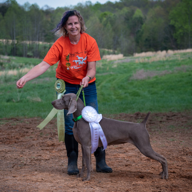 In a torrential downpour, Pizza and Dolphin successfully completed their land and water retrieves to earn their Novice Retrieving Dog titles. Many thanks to the Tarheel Weimaraner Club for hosting the ratings test in North Carolina.
